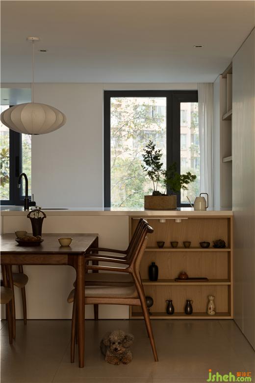 原來北邊的家政陽臺因為功能轉(zhuǎn)移,連同中廚一起被打開,開放式廚房島臺和餐桌的組合,進一步賦予生活場景更多的互動性。