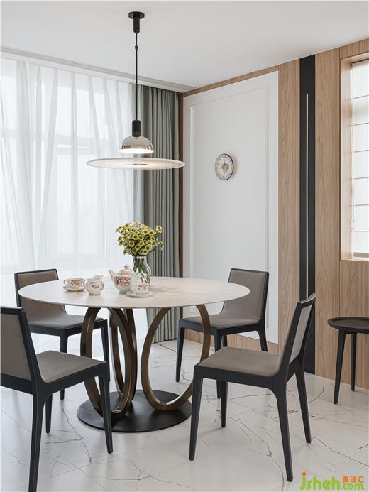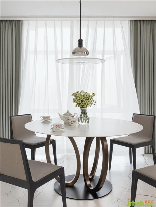 家裝設(shè)計在靠窗的位置選用金屬和大理石的圓形餐桌,