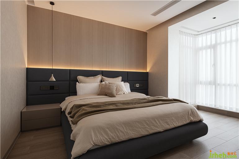 走進(jìn)臥室,原木色的墻面搭配黑色的軟包,筆直的時尚吊燈和墻面讓臥室的精致度得到大幅提升,潔白的窗簾也讓暗色的空間眼前一亮,讓人充分感受現(xiàn)代安靜的生活方式訴求