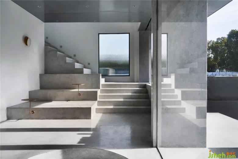 階梯作為連接三層空間的主要路徑,承擔(dān)著三維坐標(biāo)軸的角色。長方體塊的直向運(yùn)動(dòng)呈現(xiàn)階梯的連續(xù)狀態(tài),在這個(gè)縱向的空間里,裝修公司設(shè)計(jì)了一個(gè)鏡頭狀的圓形窗,使這個(gè)縱向路徑有了橫向的視線,同時(shí)鏡頭的形式給窗戶的功能帶來窺視感,形成趣味性的第二空間體驗(yàn)。