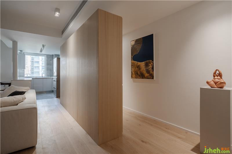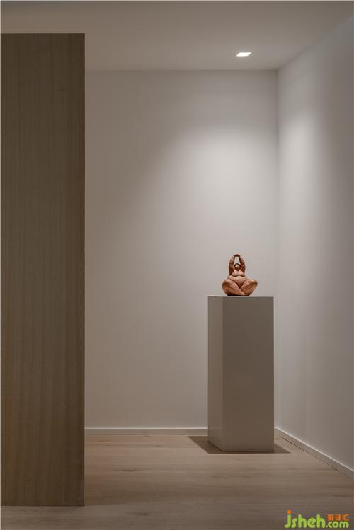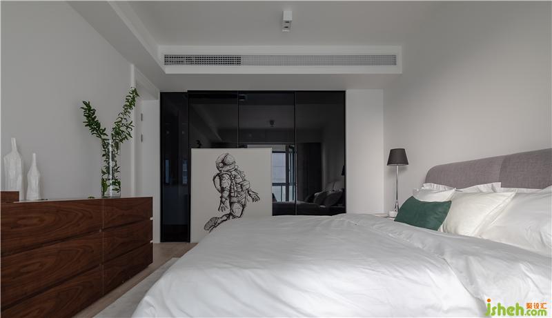 7、主臥室放置一副體量很大的太空宇航服畫面,看似和整個(gè)空間沒有關(guān)系,卻充滿另類裝飾意味,與寧靜素雅的臥室背景形成一種碰撞和對話。主臥原有布局較為傳統(tǒng),進(jìn)門正對衛(wèi)生間,品承團(tuán)隊(duì)將之前的進(jìn)戶門進(jìn)行改動(dòng),在不大的衛(wèi)生間里分離出臺(tái)盆、淋浴間、馬桶區(qū),并利用一面不透玻璃和一面鏡面夾交成的1.2公分厚的隔斷墻,隔出一個(gè)獨(dú)立的L型的小衣帽,鏡面反射讓衣帽間顯得寬敞很多。