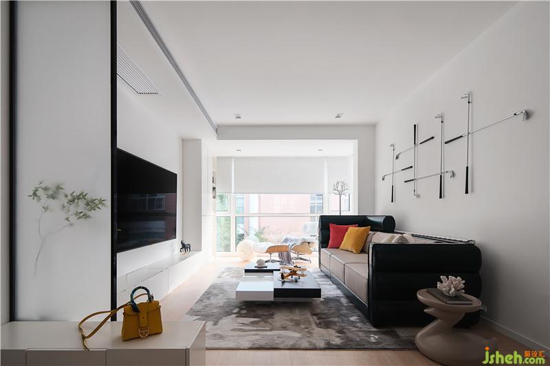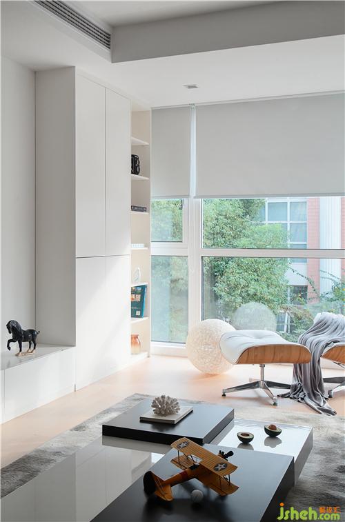 客廳面積較小,整體比例失衡,室內(nèi)設(shè)計師于是將陽臺做成全落地玻璃結(jié)構(gòu)納入客廳范圍,這樣“去陽臺化”的處理讓客廳視覺和實際感官都更為開敞,沙發(fā)、邊椅都可以放置其中。同時,窗外的自然景物被引入室內(nèi),空間更加通透愜意。一組白色高柜陳列架既滿足日常小物的收納與展示,又消弭掉此處原本門洞遺留下的痕跡。