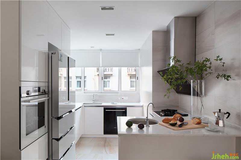 業(yè)主喜歡簡潔清爽的生活空間,不希望有太多裝飾堆棧?;谒麄兊纳盍?xí)慣與方式,廚房采用了敞開式設(shè)計,高柜加低柜組合滿足豐富的收納,半導(dǎo)體、吧臺的設(shè)置可以靈活使用。廚房與餐室之間沒有切隔,光線和視野可以自由游移,加大既有空間的明亮感和通透性。