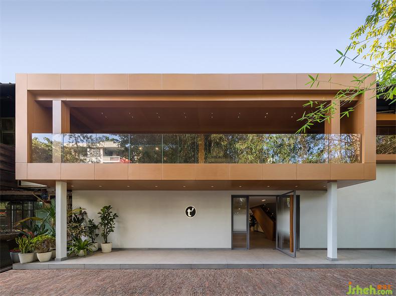 在二層置入兩個木色盒子,提供一個讓建筑、人與自然交互的接觸面。辦公室設(shè)計一個盒子平行于建筑面寬,提升顏值充當(dāng)陽臺;另一個盒子與之垂直,獨立存在于室內(nèi)空間,通過倆端的開窗聯(lián)通室內(nèi)外,形成自然和室內(nèi)的對話,用于分享靈感和溝通討論。