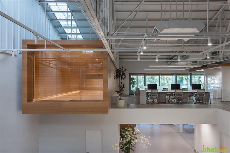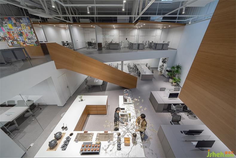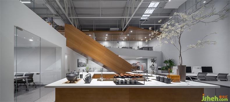 普悅設(shè)計將樓梯以空間裝置的形式嵌入進(jìn)來。一組置于回形吧臺后,辦公室設(shè)計裊裊升起的茶香,沿著樓梯向上升騰;另一組置于一樓入口右側(cè),提供高效的空間動線。兩組樓梯與研發(fā)吧臺互相呼應(yīng),形成視覺上的整體。