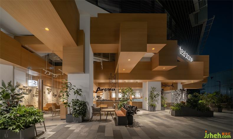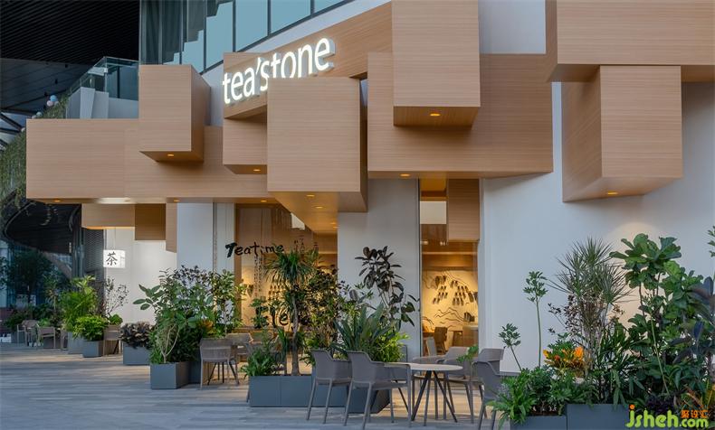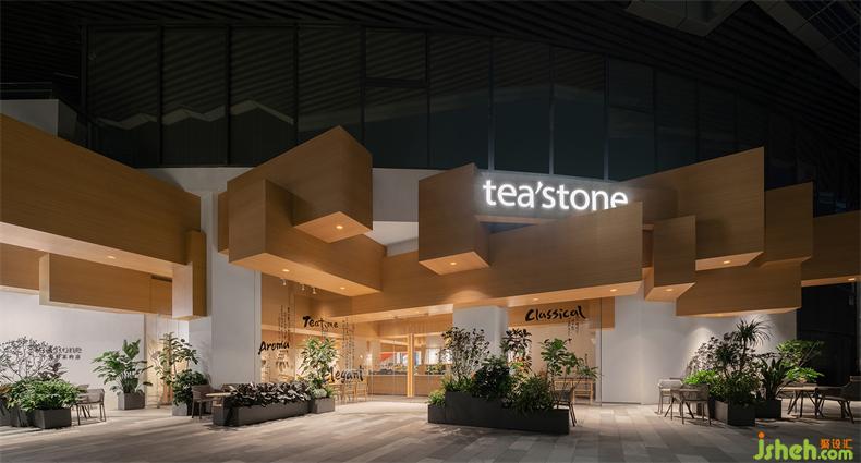 萬象前海是tea'stone在深圳的第5家門店。室內(nèi)設計師店鋪位于商場一層最東側的入口廣場位置,這是可資利用的資源。建筑外立面為弧形幕墻,氣質(zhì)上不太符合品牌調(diào)性;左側上方的挑臺侵入商鋪門頭招展面,于設計而言,是很大的不利因素。