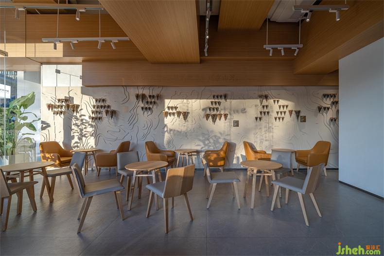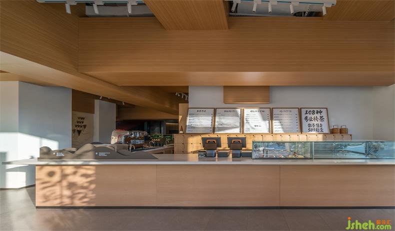 吧臺(tái)仍然是空間的重心,山形擺件形成獨(dú)特的吧臺(tái)景觀,與對(duì)面“茶色大地”裝置墻形成整體,集合中國茶山人文地理、茶樣及風(fēng)土樣本,品牌方用裝置藝術(shù)化的語言表達(dá)出當(dāng)代中國茶的博大精深。