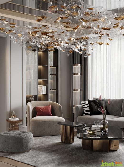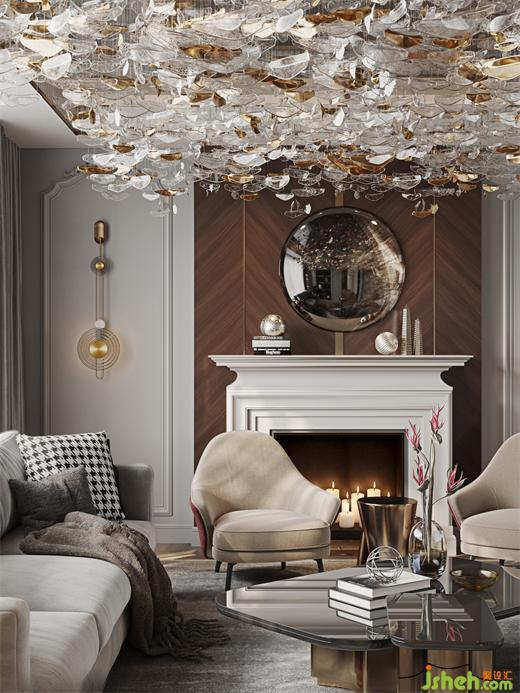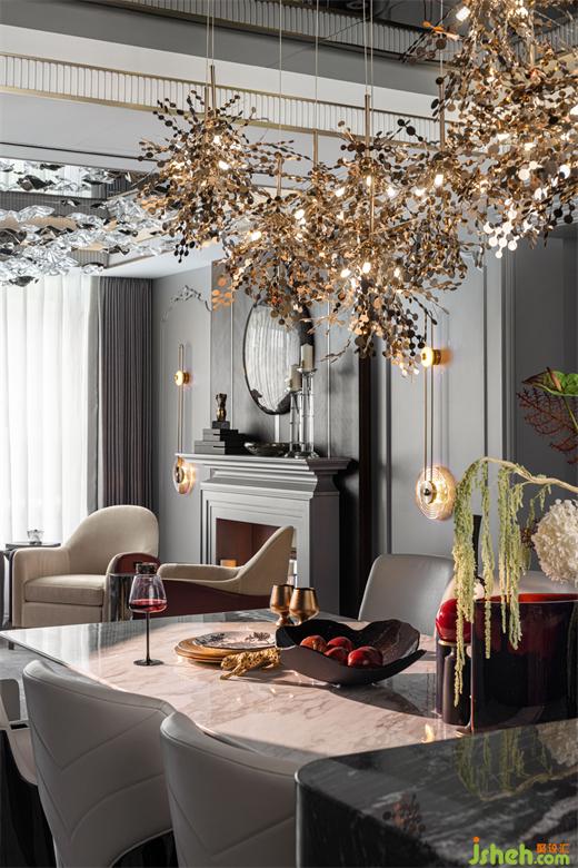起居空間頂面以灰鏡擬態(tài)蒼穹玄夜,懸以水晶,如垂列星、如水漣漪、璀璨晶瑩、光映微庭。世事庸擾間,信仰的蒼穹仍然閃耀,仍然承載著自由、創(chuàng)造、以及某種幸福的形象,樣板房設(shè)計(jì)將一種意料之外的視覺(jué)刻畫(huà)與理性之美,結(jié)合地很好。