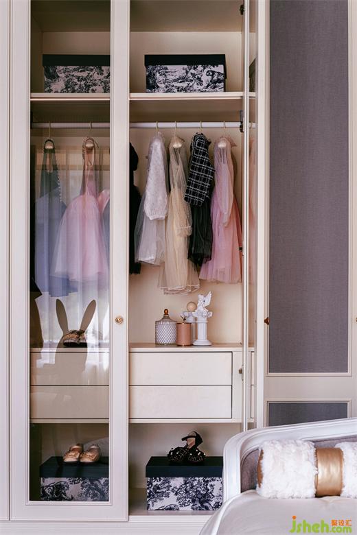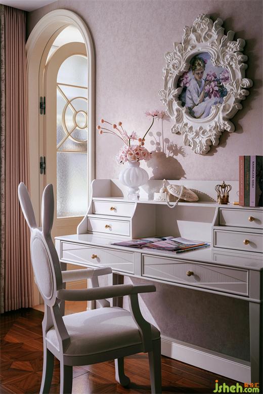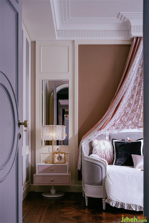 更為輕盈柔美的,也更富戲劇性的,是女兒房的設(shè)計。樣板房設(shè)計粉色與白色紗簾的結(jié)合,籠住一室天真浪漫幻想、和對公主般精致生活的憧憬。屋中的美學核心是如「吉賽爾皇冠」般完美形態(tài)的大床,緩緩勾勒著對小主人皇冠上珍珠般的憐惜疼愛。