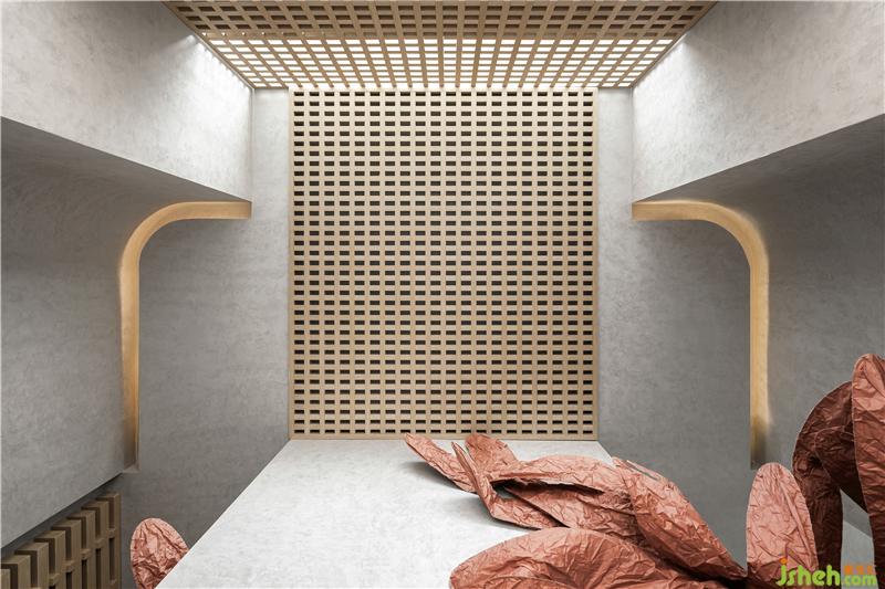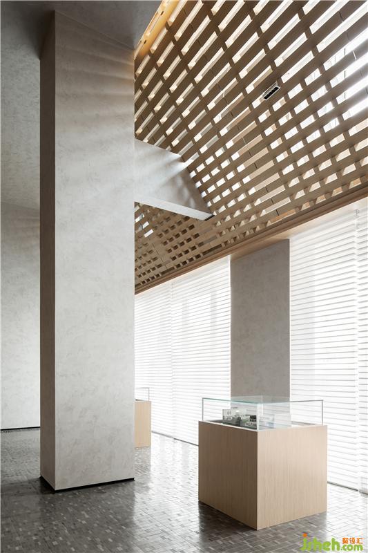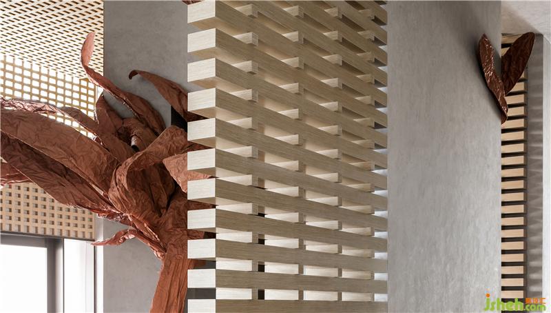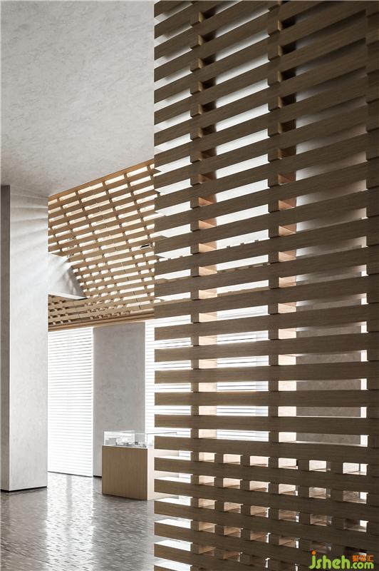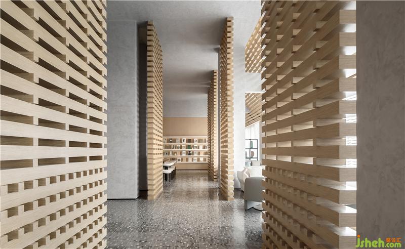 層層向上疊加式的木格柵也傳遞出“累積”及“向上”的精神。同時(shí)也滿足墻體的圍合功能,具有充分的通透性,也帶來功能空間效率與氣質(zhì)的全新可塑性。何處舒展、何處緊湊、何處過渡、何處延伸,何處功能為重,何處鋪排視覺,自由度大為拓展。