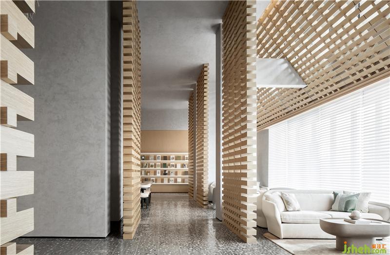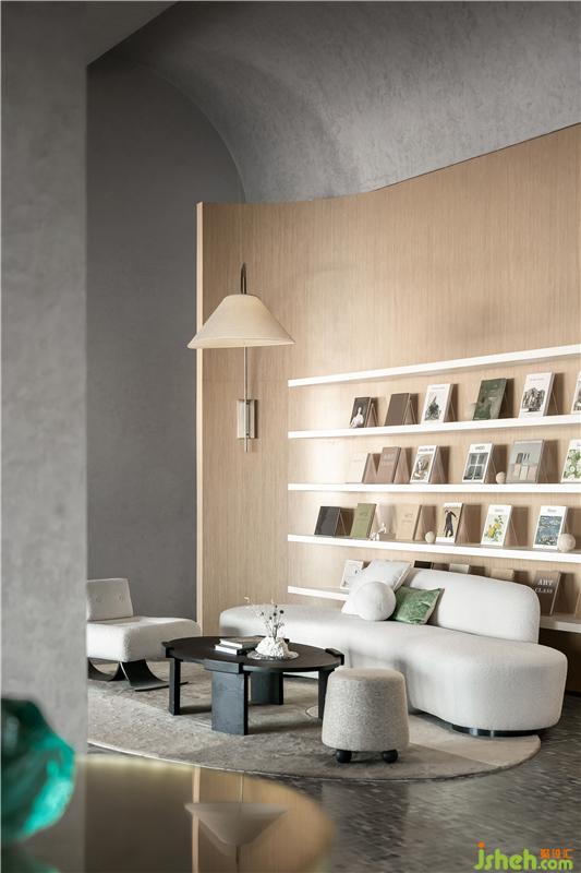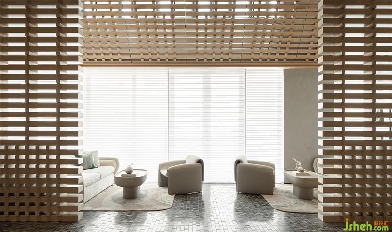 木材的大面積律動應(yīng)用,溫暖而寧靜;立面及頂面定制調(diào)配的藝術(shù)涂料,影影綽綽、細(xì)膩層次的暗紋圖形,奠定了整個空間的柔和性、優(yōu)雅度和親密感深圳售樓處設(shè)計。
