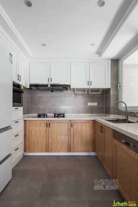 室內(nèi)設(shè)計(jì)師利用原木色的地柜搭配白色吊柜,打造清新自然整潔的廚房,直飲水、管線機(jī)、蒸烤箱、洗碗機(jī)、垃圾處理器等廚房設(shè)備一應(yīng)俱全,制造更輕松愉快的下廚體驗(yàn)。