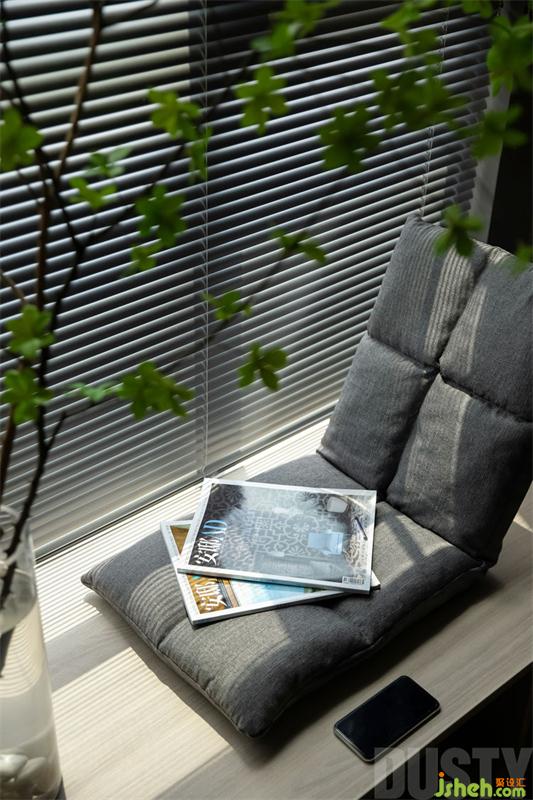 整體組合柜旁邊剛好利用這個陰進(jìn)去的面做了一整塊灰鏡,讓整個飄窗陽臺空間在視覺上擴(kuò)大的同時還和電視機(jī)有了一定的比例關(guān)系。