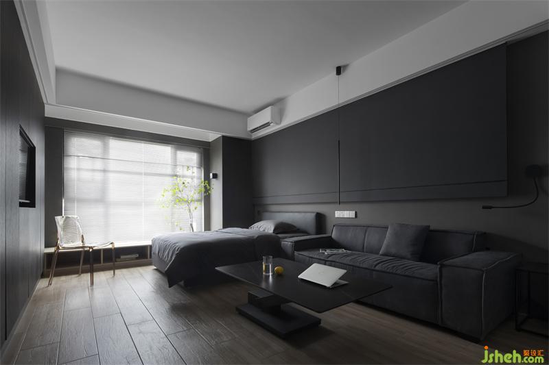 公寓設(shè)計為了背景燈光氛圍效果的呈現(xiàn)的同時還把兩個家具聯(lián)系起來,床頭和沙發(fā)背景墻設(shè)計了一組懸空造型板,使得看上去更加的整體。