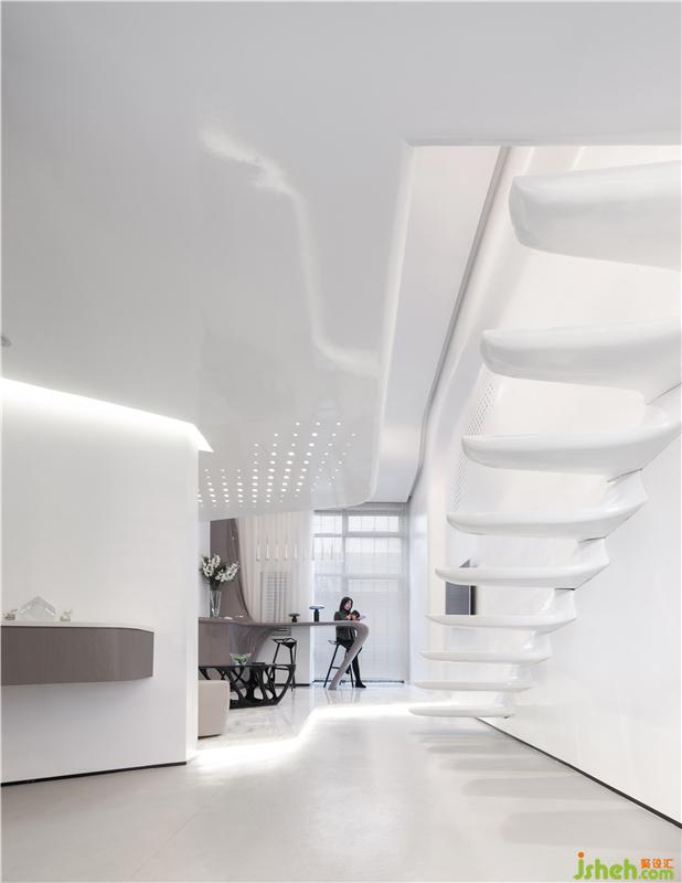 LOFT樣板間運(yùn)用扎哈的異形造型營(yíng)造時(shí)尚、品質(zhì)的超現(xiàn)代生活意境,實(shí)現(xiàn)了小戶型里的豪宅夢(mèng)。連接夾層的“魚骨樓梯”和“流水瀑布吧臺(tái)”是本案的亮點(diǎn),藏山水之美,于一室之中,一體成型的雕塑感造型,增加了空間的藝術(shù)氣質(zhì)。室內(nèi)設(shè)計(jì)師