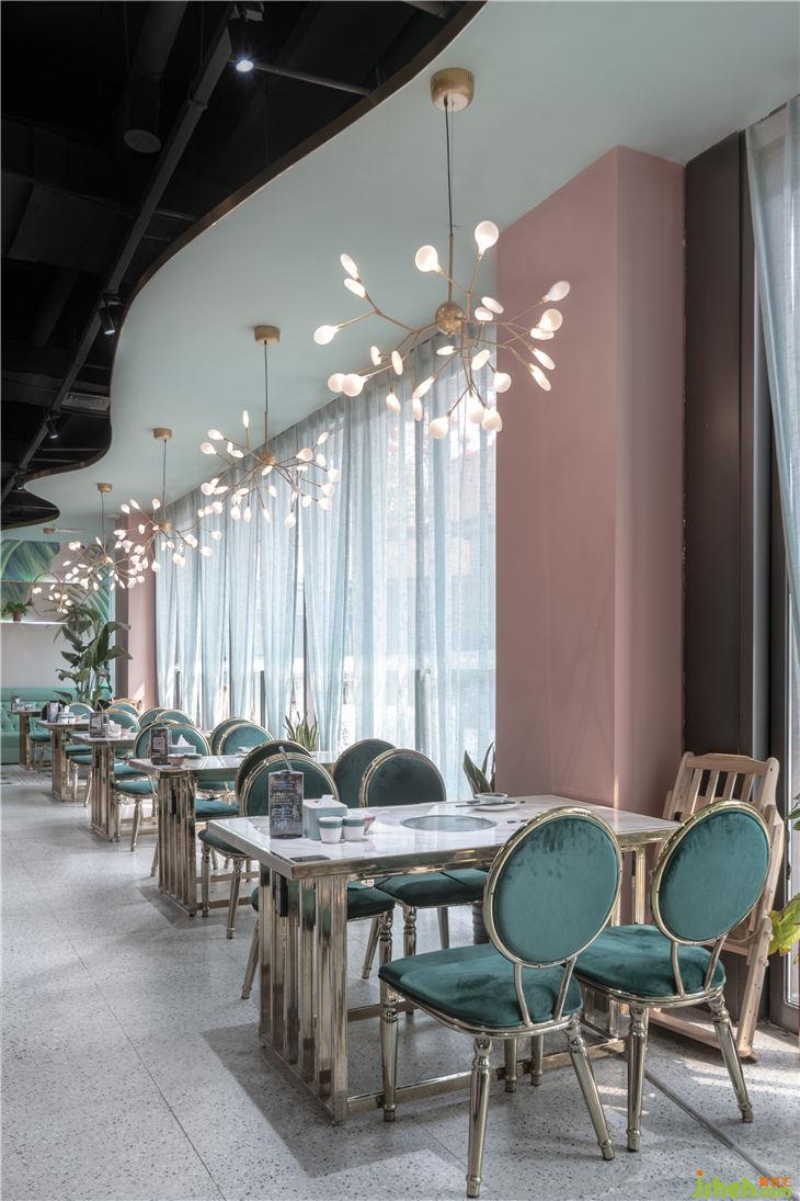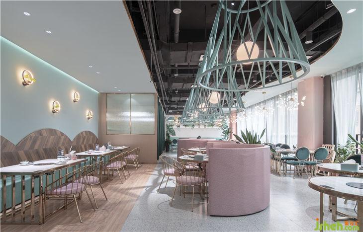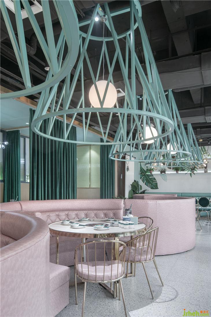 餐廳幾何形的定制燈具和墻面造型增加現(xiàn)代和變化的葉片抽象元素,薄荷綠與裸粉色的搭配符合椰子雞定位的女性客戶需求以及花夕美人的意向情景
