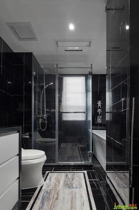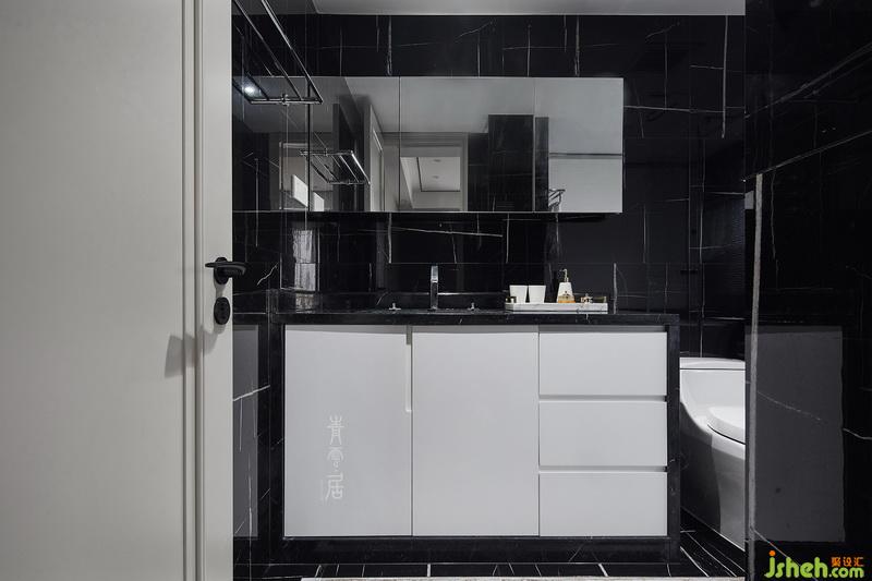 ▲純黑色系的衛(wèi)生間會(huì)不會(huì)太酷?在整體色調(diào)上,大面積的黑色大理石紋墻磚,搭配白色浴室柜效果非常的出色,起到瞬間顛覆傳統(tǒng)衛(wèi)生間風(fēng)格的作用,酷的沒(méi)道理。