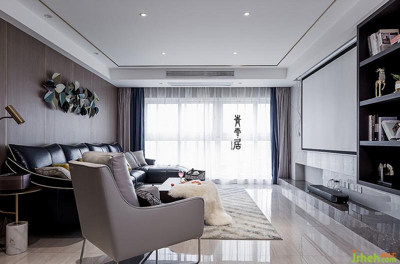 客廳在色彩上通過灰棕與黑白之間的對比協(xié)調(diào)追求一種具有普遍意義的永恒主題。沙發(fā)背景墻用的是飾面板+不銹鋼線條,相對來說比其他材質(zhì)更時尚、溫馨協(xié)調(diào)。