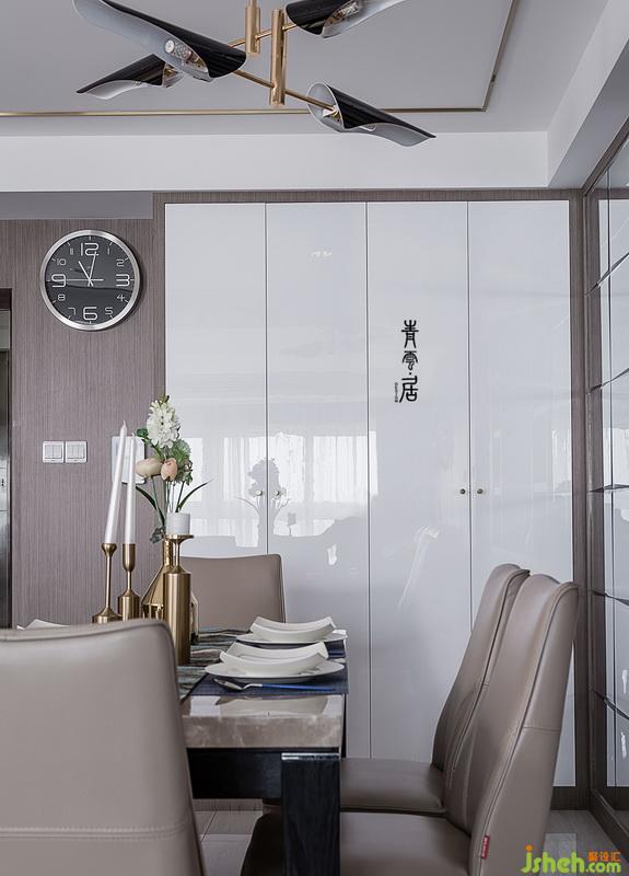 餐邊展示柜設(shè)計公司沿用了客廳的主題,達到視覺上的統(tǒng)一感,不僅從色彩上營造出和諧感,一旁的鏡面讓餐廳在橫向上有延伸空間的視覺效果。