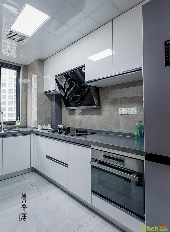 U字形廚房區(qū),設(shè)計公司定制了整面的廚柜,將廚房雜物收納妥當(dāng),即便是白灰色的簡單空間,也顯得清爽潔凈。
