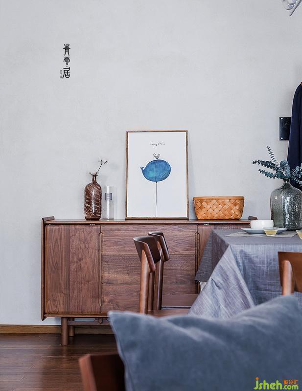 在本案的搭配上,室內(nèi)設(shè)計(jì)師使用了清雅的藍(lán)色系、內(nèi)斂的灰色氣質(zhì)與黑胡桃木和諧相融。黑胡桃木,凸顯出一種歲月的質(zhì)感,金屬,擺出生活儀式感。