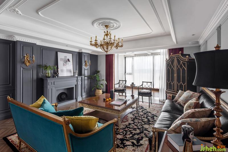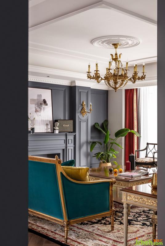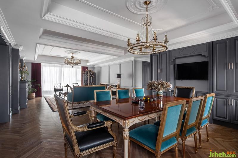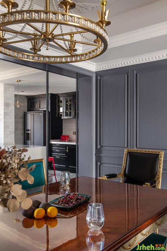 每個(gè)功能區(qū)之間的連接緊密又互相獨(dú)立,寬敞的客廳明亮通透,設(shè)計(jì)師選擇在同一個(gè)色彩體系系中,用孔雀藍(lán)進(jìn)行延伸?;疑档倪吂裰虚g放置電視,懸掛著的金色水晶吊燈,充滿異域風(fēng)的花紋,讓復(fù)古與現(xiàn)代交替的魅力延伸至此。