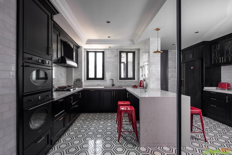 對(duì)于享受料理時(shí)光的屋主來(lái)說(shuō),寬敞的廚房區(qū)是必不可少的,從儲(chǔ)物柜到中島吧臺(tái),都讓屋主可以自在的大展身手,室內(nèi)設(shè)計(jì)師利用透明的推拉門(mén)作為廚房與餐廳的分隔,廚房?jī)?nèi)精致的黑色櫥柜與強(qiáng)烈?guī)缀螆D案地磚,紅色家具與電器點(diǎn)綴其中,營(yíng)造出豐富的視覺(jué)感受。