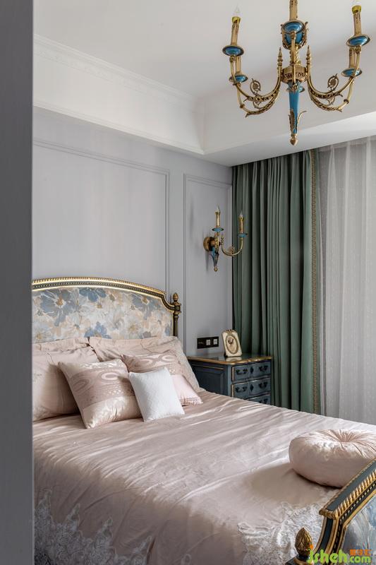衣帽間選用了房主喜愛(ài)的綠色為主色,同房間粉色窗簾,地面人字拼鋪貼木色地板,上面擺放張換衣凳,復(fù)古的鏡面裝飾,粉、綠、金的搭配讓空間變得更加靈動(dòng)有趣,豐富且優(yōu)雅。