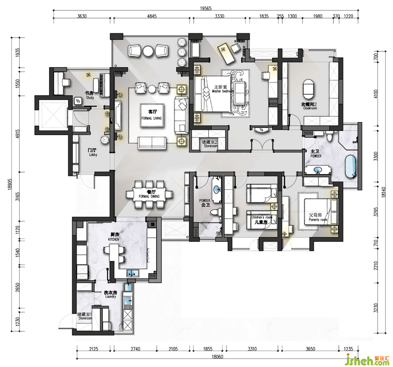黑色給人深沉莊嚴(yán)之感,加上金色的大氣、紅色的耀眼,莊重而不失美感,當(dāng)黑色與金色相遇,復(fù)古與時(shí)尚的拿捏恰到好處,黑色玻璃拉門(mén)增加透光度,展示柜里裝滿了屋主多年從各地收集來(lái)的娃娃,室內(nèi)每一角落都做到完美與精致。