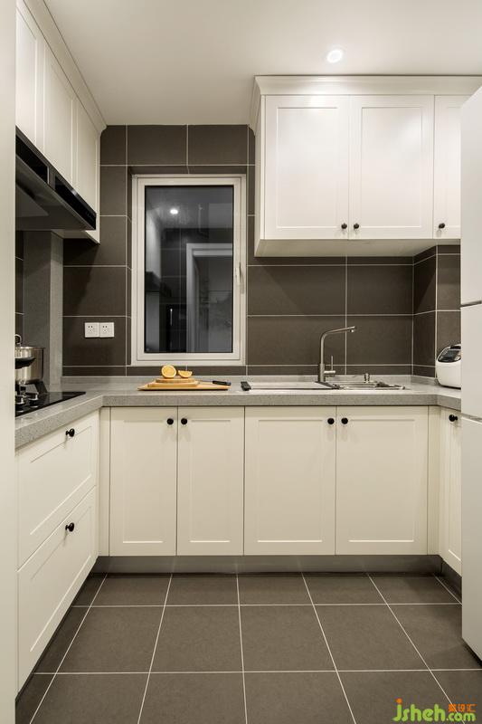 簡(jiǎn)約格調(diào)的U字型廚房操作流程合理,深灰色瓷磚搭配白色櫥柜,使得空間的色澤感覺十分平衡。