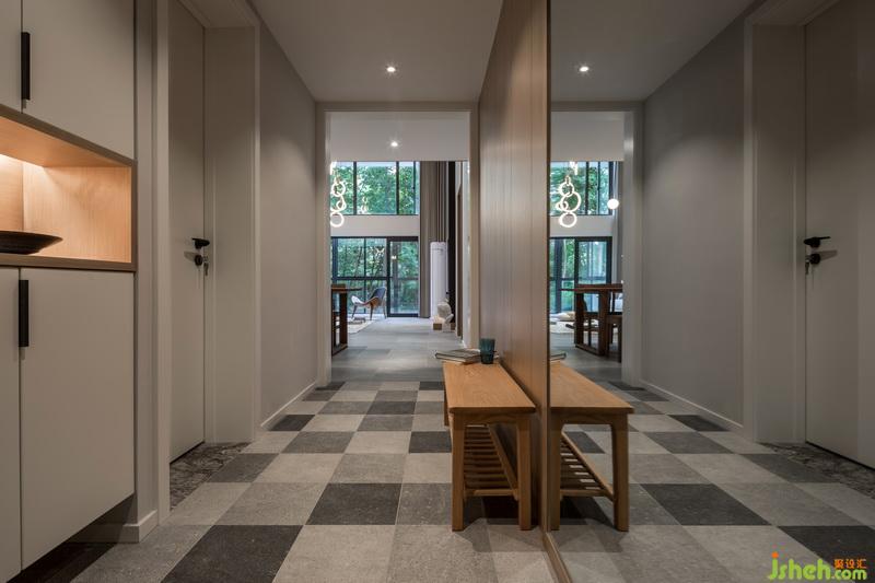 玄關(guān)處的鏡子很加分,起放大空間的效果。鞋柜與換鞋凳等很好的滿足生活的需要,格子地磚作為玄關(guān)與客餐廳的空間區(qū)分,沒有多余的裝飾,簡潔自然。