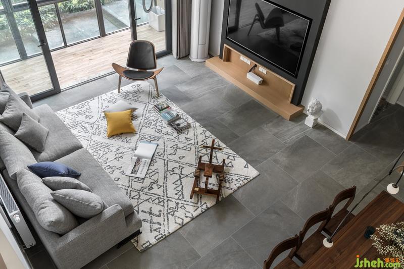 在二樓以俯視的角度拍攝客廳全貌,灰色布藝沙發(fā)與北歐風(fēng)地毯上,藍(lán)黃色抱枕作為跳色活躍了整個(gè)空間