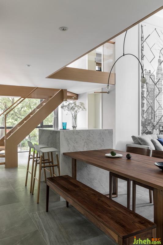 實木家具具有獨特清晰的紋理,散發(fā)著木材特有的香氣和來自森林的自然氣息。注重質(zhì)感的白色大理石吧臺,打破空間,卻又不喧賓奪主,很好的融入其中。