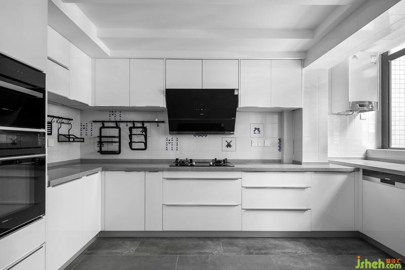 廚房的設(shè)計選材和色彩搭配上,注重實用與美觀并存法。廚房原槽鋼鋪設(shè)的假梁保留,視覺上起到增加層高的作用。