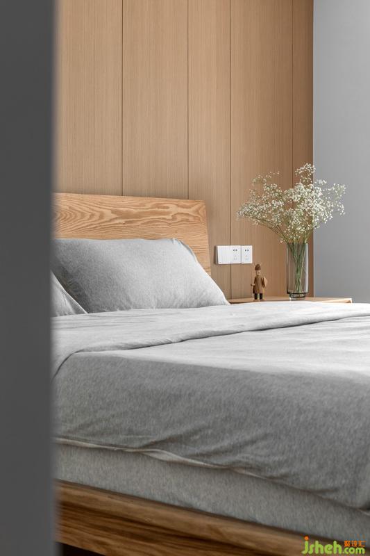 主臥整體色調(diào)比較淡雅,以木色為背景再加上大面積,落地窗的加持一副窗簾隔開室內(nèi)與室外半藏半露之間透出的綠色,很符合我們“家庭與自然”的主題