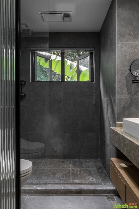 衛(wèi)生間整體統(tǒng)一的深灰色水泥磚,淋浴區(qū)地面用了大理石拉槽方便排水還增加防滑的功能