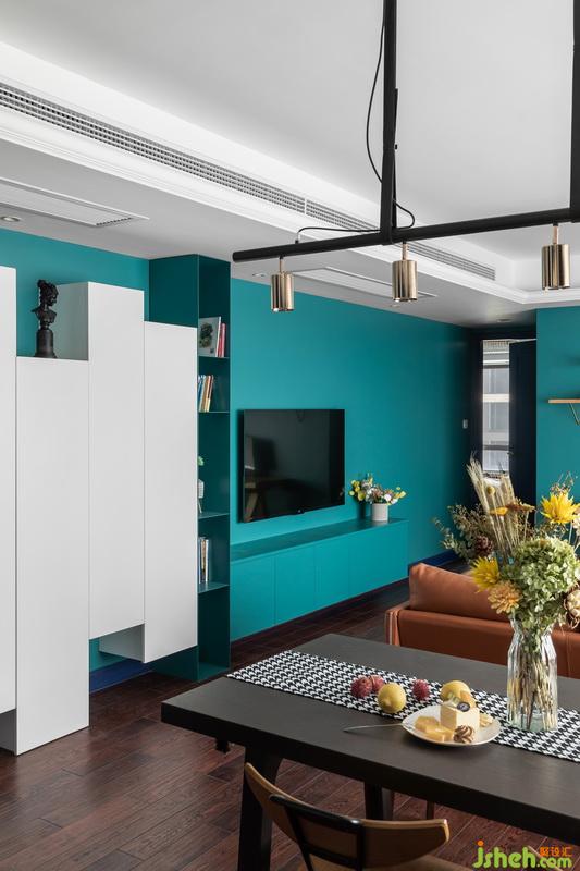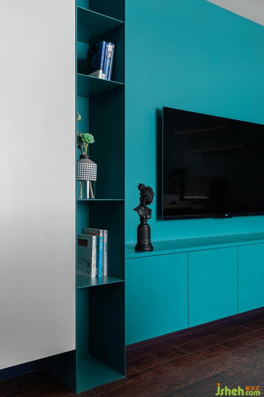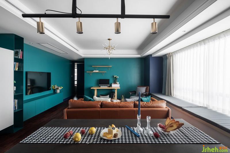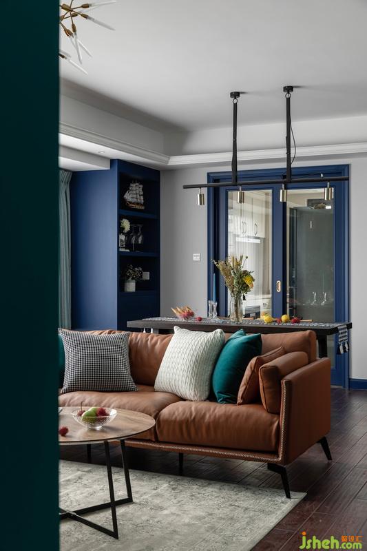 要如何挽救保留紅棕色地板后的壓抑感,設計師重在色彩搭配上面下功夫。使用冷色系如藍色墻面柜體等,形成強烈的視覺對比沖擊,讓我們視覺上移,減少地面對空間造成的壓抑。暖色系如地板沙發(fā)等紅棕色,中間色如黑白色。最后運用這些進行組合,得出一個高色彩對比度的作品。