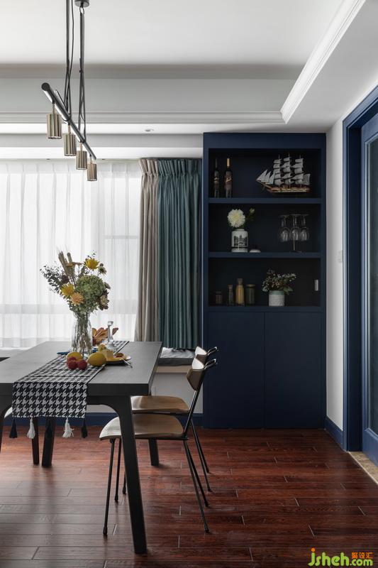 客餐廳開放式設(shè)計(jì),使得空間視覺(jué)上得以延伸。簡(jiǎn)約餐桌椅,精心布置的桌面、裝飾柜,多了些生活中的儀式感,大面積飄窗為空間增加采光度。