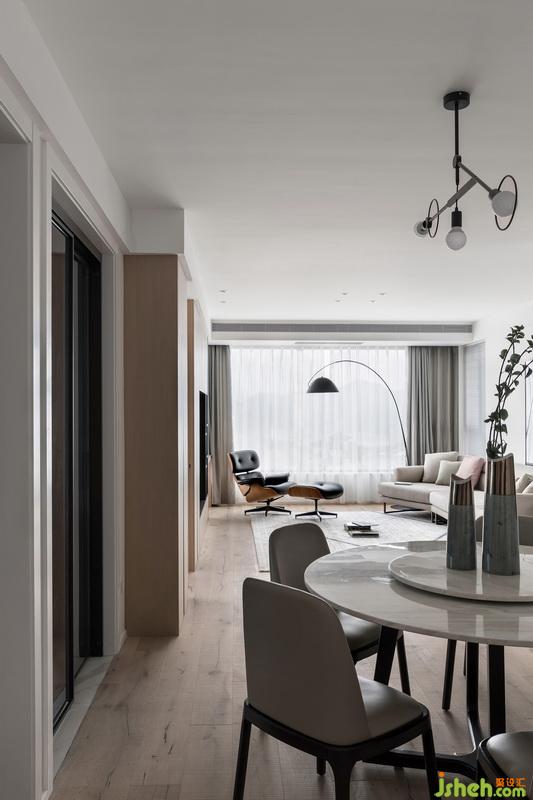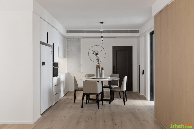 從客廳看向餐廳,一覽無余的視角拓寬了視覺空間,讓室內(nèi)層次分明,沒有一絲壓抑感,自由舒暢。原廚房隔墻拆除換成推拉式玻璃門,保證餐廳里光線以及空氣的流通。餐廳以白色為基礎(chǔ)色,簡(jiǎn)約吊燈配以大理石餐桌和灰色餐桌椅,增加空間的質(zhì)感。