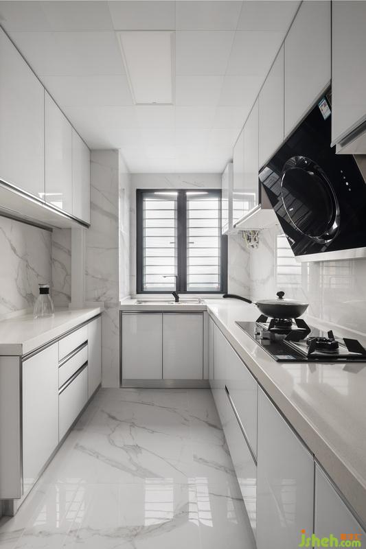 U型廚房,室內(nèi)設(shè)計(jì)師合理的動(dòng)線安排,讓廚房更加人性化。白色櫥柜搭配白色大理石,廚房擁有如此巨大收納量的柜體看上去依然清爽明亮。