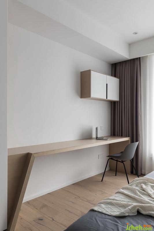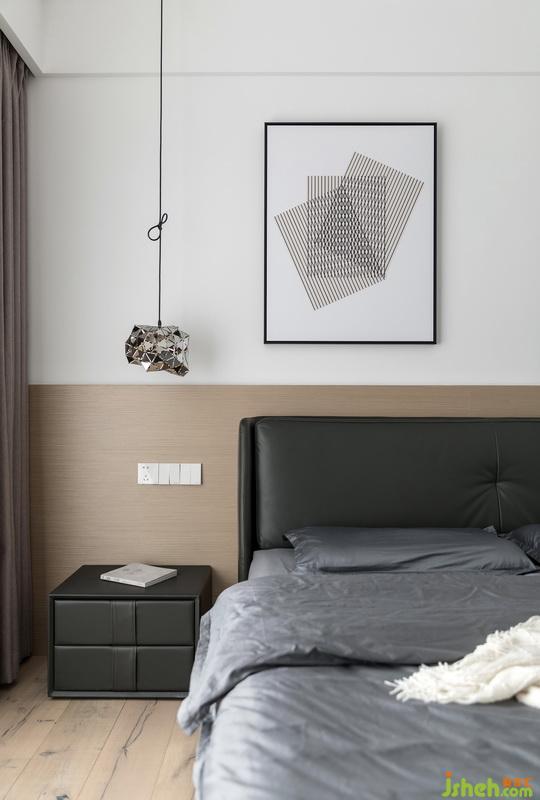 主臥是夫妻倆的私人空間,整個(gè)空間以飽和度較低的色調(diào)為基底,室內(nèi)設(shè)計(jì)師使用大量的木質(zhì)材質(zhì),如地板、桌子與護(hù)墻板,搭配黑色、灰色床與床品,時(shí)尚不失簡(jiǎn)約。大窗戶良好的采光為室內(nèi)營(yíng)造出潔凈溫暖的視覺感受。