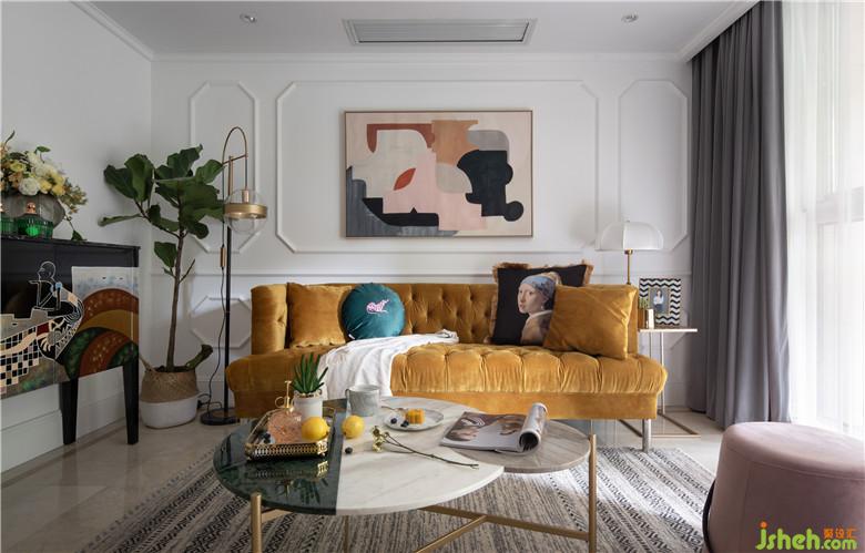 將墻面的墻紙和電視背景墻進行拆除,墻面批膩子后做了線條做裝飾。軟裝搭配上,亮黃色沙發(fā)是整個空間視覺的焦點,裝飾畫與沙發(fā)邊柜風格相呼應,充滿了摩登與藝術感。