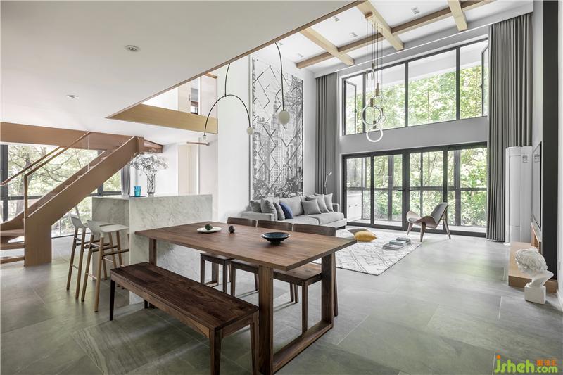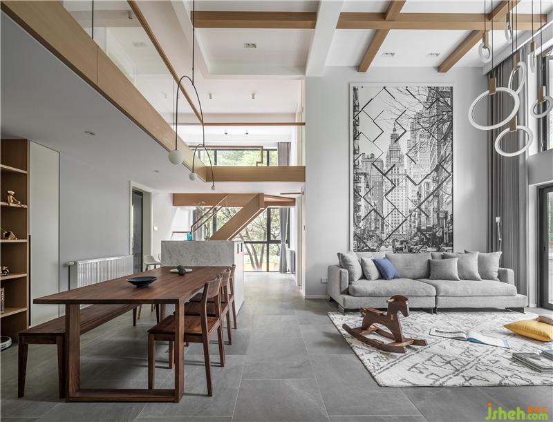因?yàn)榧抑杏行『⒑烷L輩,在風(fēng)格的選擇上面,中和各成員意見,室內(nèi)設(shè)計(jì)師建議現(xiàn)代簡約風(fēng)格,大面積的落地窗,得以讓綠色肆意的展現(xiàn)在家中,穿插原木色,讓整個(gè)家里充滿溫馨感。這種設(shè)計(jì)的美,在于家庭和自然相結(jié)合,低調(diào)而內(nèi)斂又不失沉靜悠然。“家庭與自然”這個(gè)主題不僅貫穿始終,更是這個(gè)空間的靈魂。