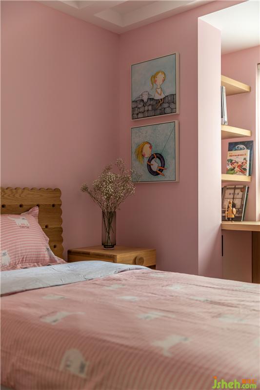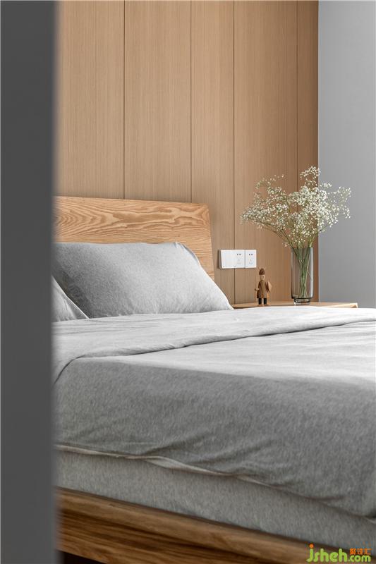 主臥整體色調(diào)比較淡雅,以木色為背景,再加上大面積落地窗的加持,一副窗簾隔開室內(nèi)與室外,半藏半露之間透出的綠色,很符合我們“家庭與自然”的主題