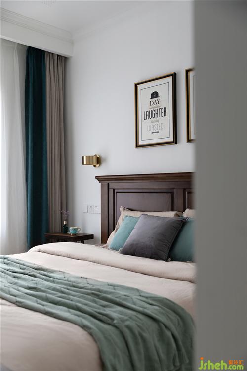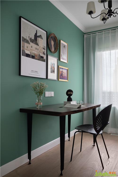 木質(zhì)矩形桌面倚墻而設(shè),墻面用了綠色,可以緩解眼疲勞,墻面上的裝飾畫既美觀又能讓這一區(qū)域看起來具有裝飾效果,一旁的窗戶則給予這間書房較為明亮的自然采光。室內(nèi)設(shè)計師