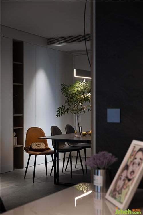 開放式的客餐廳拓寬了視野,將空間尺度拉升到極致,利用每一個角落,搭配白色長吊燈,杭州裝修設計讓視線由遠及近,借助客廳的光,形成補光效果。