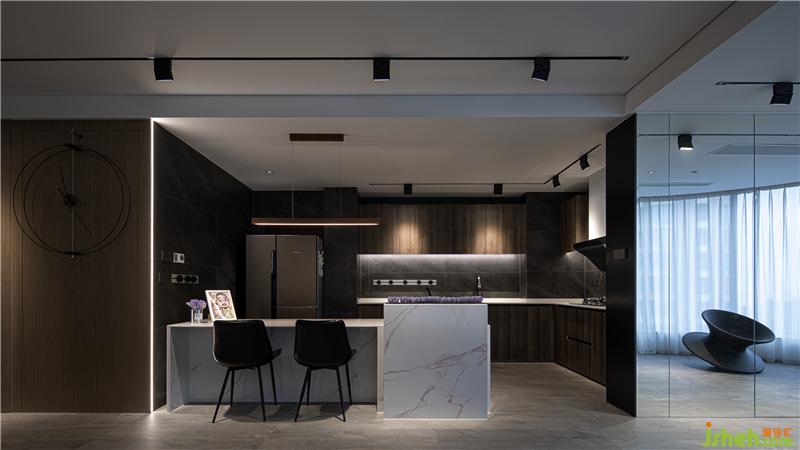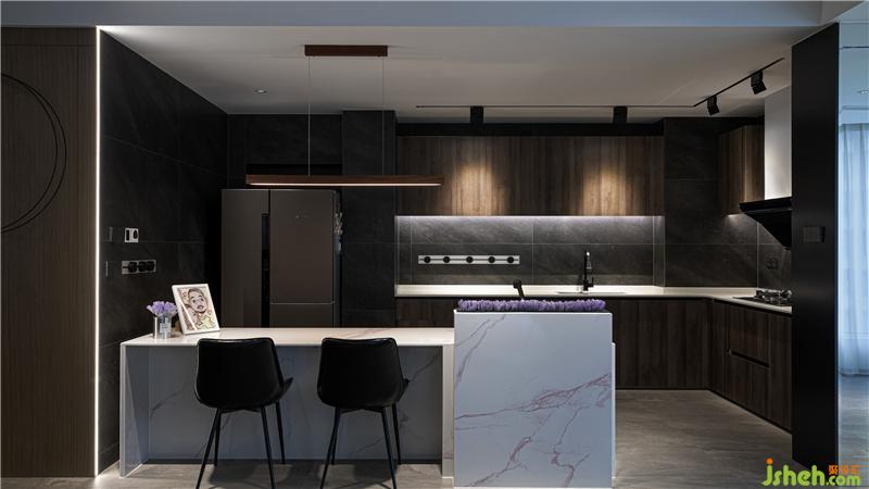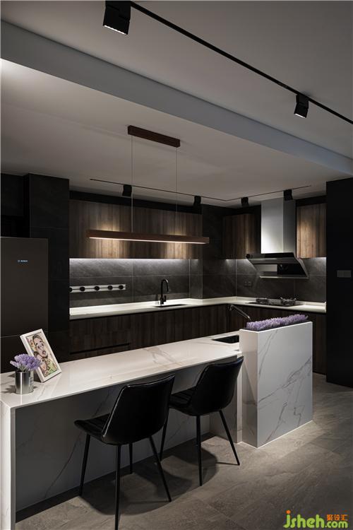 原始結(jié)構(gòu)的廚房相對較小,優(yōu)化之后的開放式廚房,與客廳、餐廳的融合,產(chǎn)生更大的視覺空間。
