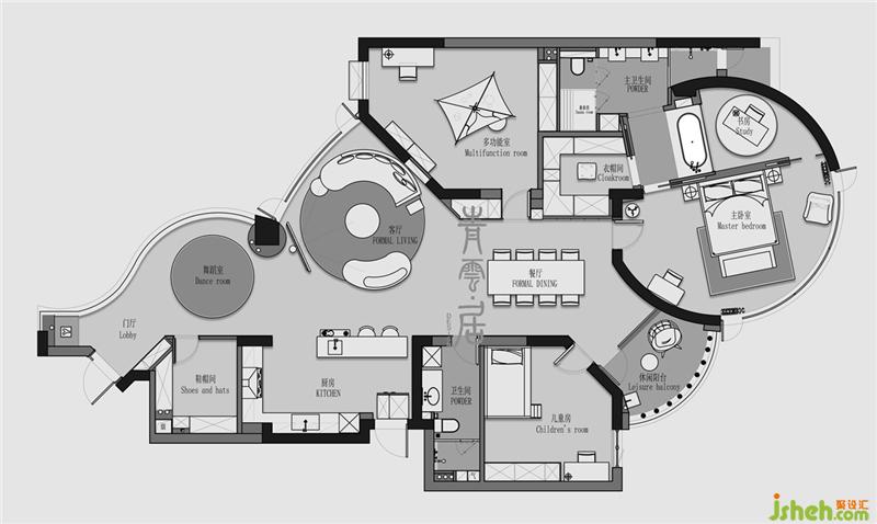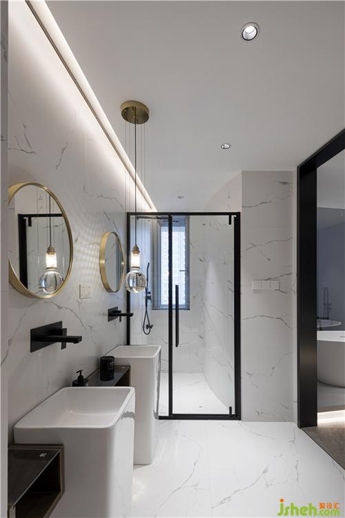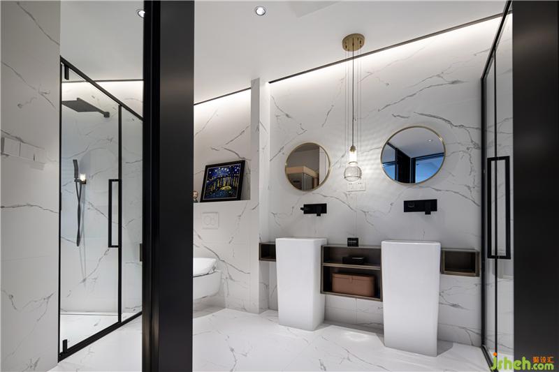 書房與浴缸也只有一“線”之隔,用玻璃隔斷,將主臥室的所有功能間都串聯(lián)起來,增大視覺空間。