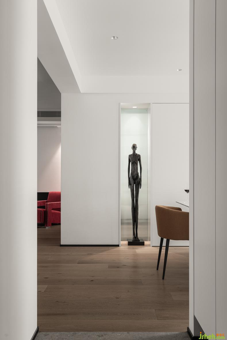衣帽間設(shè)計(jì)的較為隱蔽,采用白色木質(zhì)移門,完美的與墻體呈現(xiàn)一致的風(fēng)格?;⌒蔚谋邶惾岷土苏麄€房間的線條,散發(fā)出的輕盈、和諧之美。