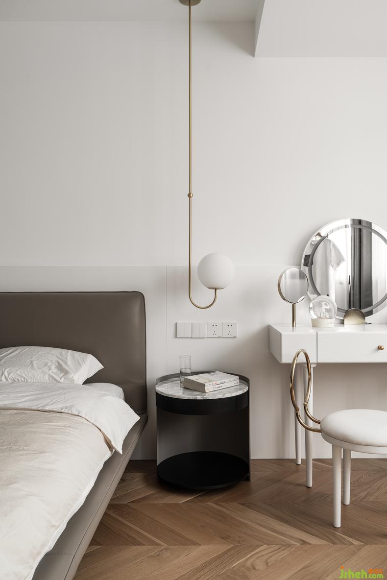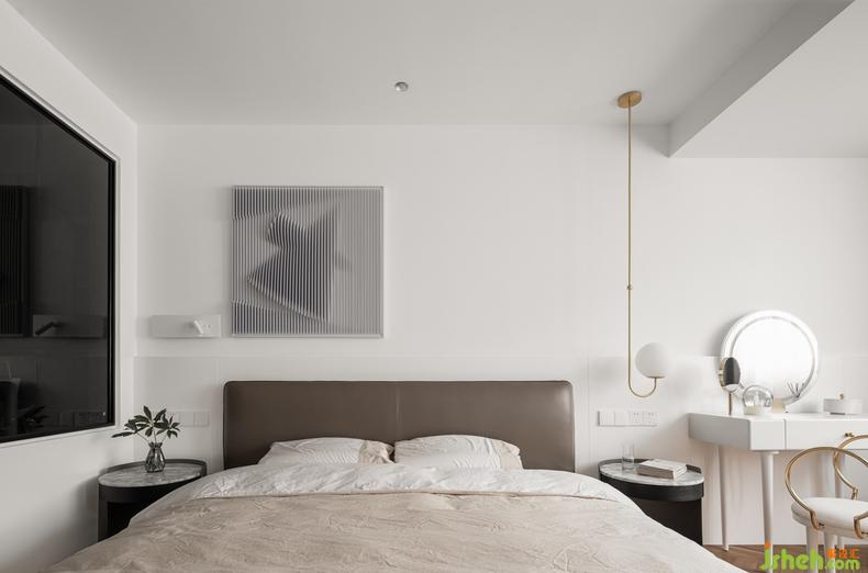 臥室往往不僅是主人休憩的地方,也是儲物的空間,裝修設(shè)計(jì)在床的左邊設(shè)計(jì)一處玻璃大窗作為主衛(wèi)的光線來源。
